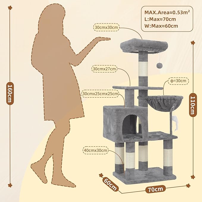 110cm Cat Tree with Toy, Cat Tower for Indoor Cats, Cat Play Tower with Padded Plush Perch, Cozy Hammock and Sisal Scratching Posts, Multi-Level House for Kittens, Light Gray