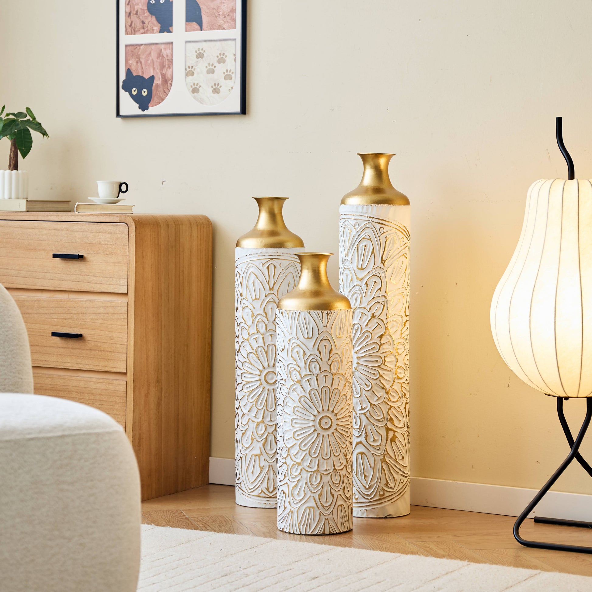 - Polished & Hammered Gold Accents – Each vase is beautifully detailed with a mix of polished and hammered gold finishes for a refined, high-end look