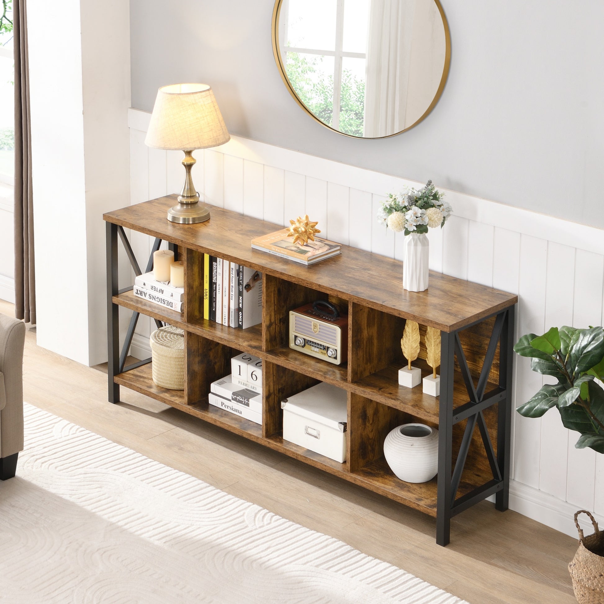 8 Cube Storage Organizer Bookshelf, Rustic Wood And Metal Cubby Bookcase, Industrial Horizontal Long Shelf For Home Office, Living Room