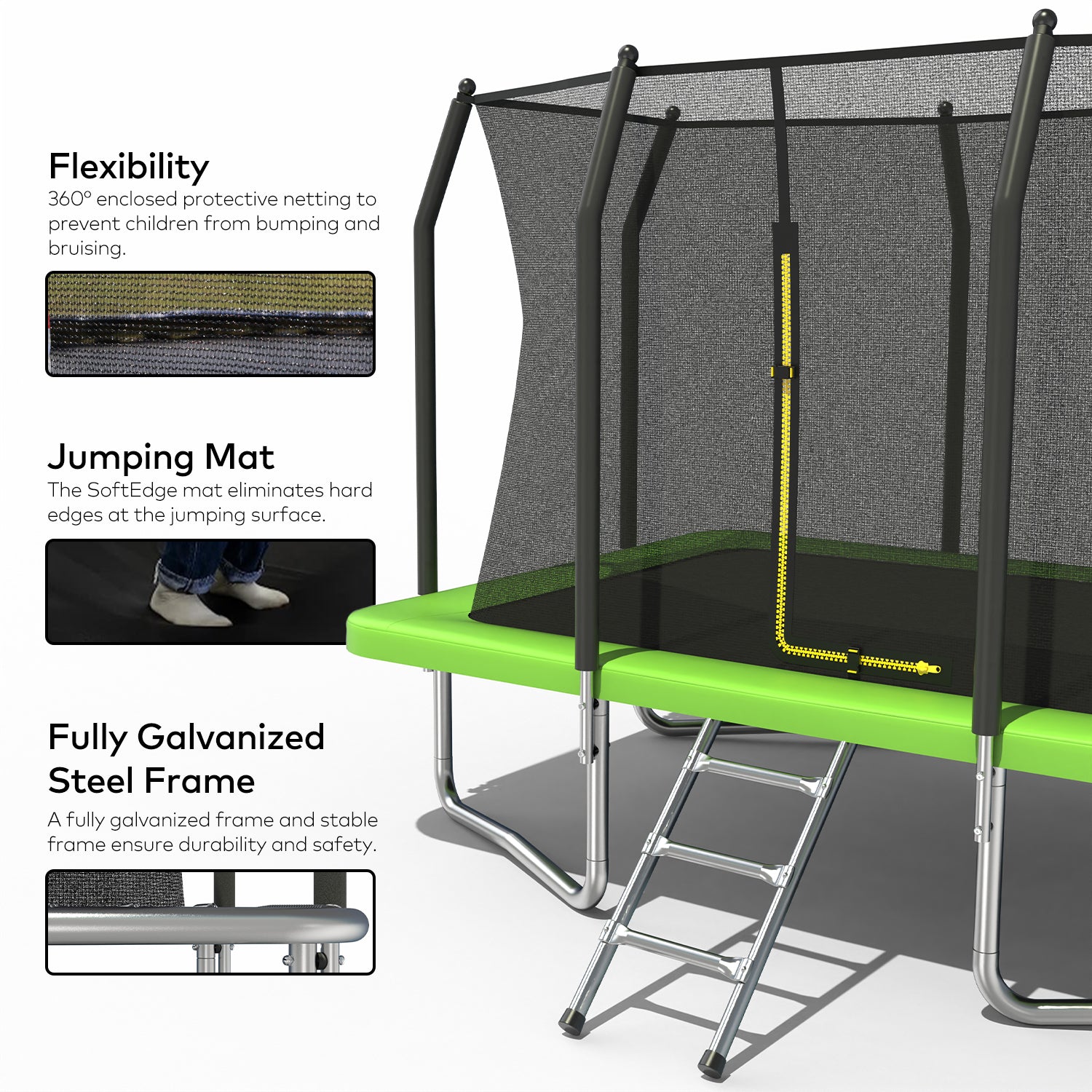 Includes: Trampoline, safety net, ladder, storage compartment