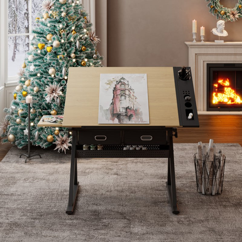 adjustable drawing drafting table desk with 2 drawers for home office and school with stool(wood)