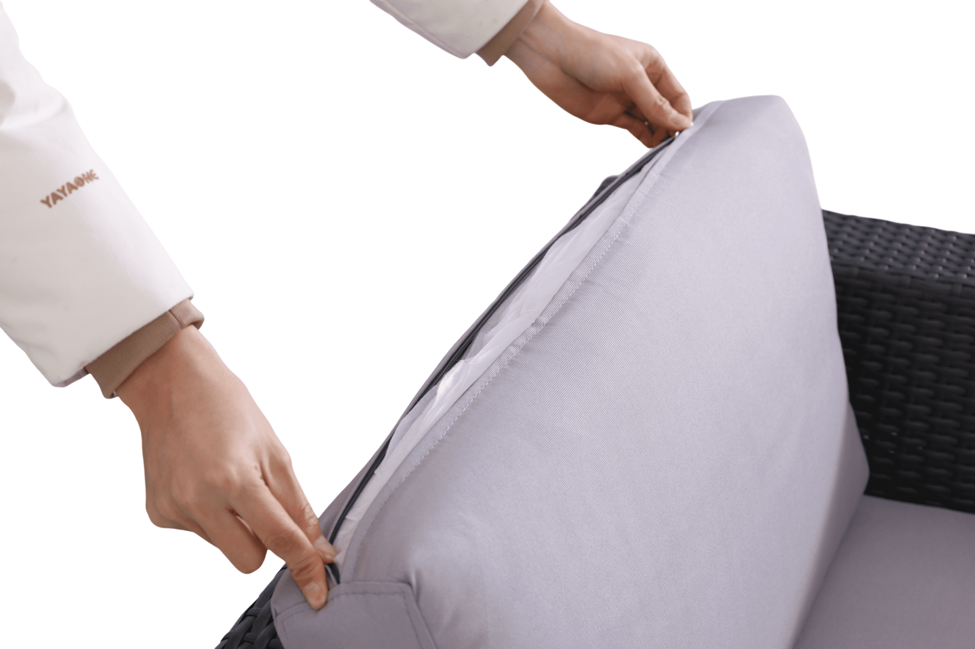 ● Versatile Modular Use——Designed with an aluminum modular base, this armless loveseat easily expands sofa sets into custom layouts—L-shaped, U-shaped, or sectional—ideal for patios, pool areas, or terraces.