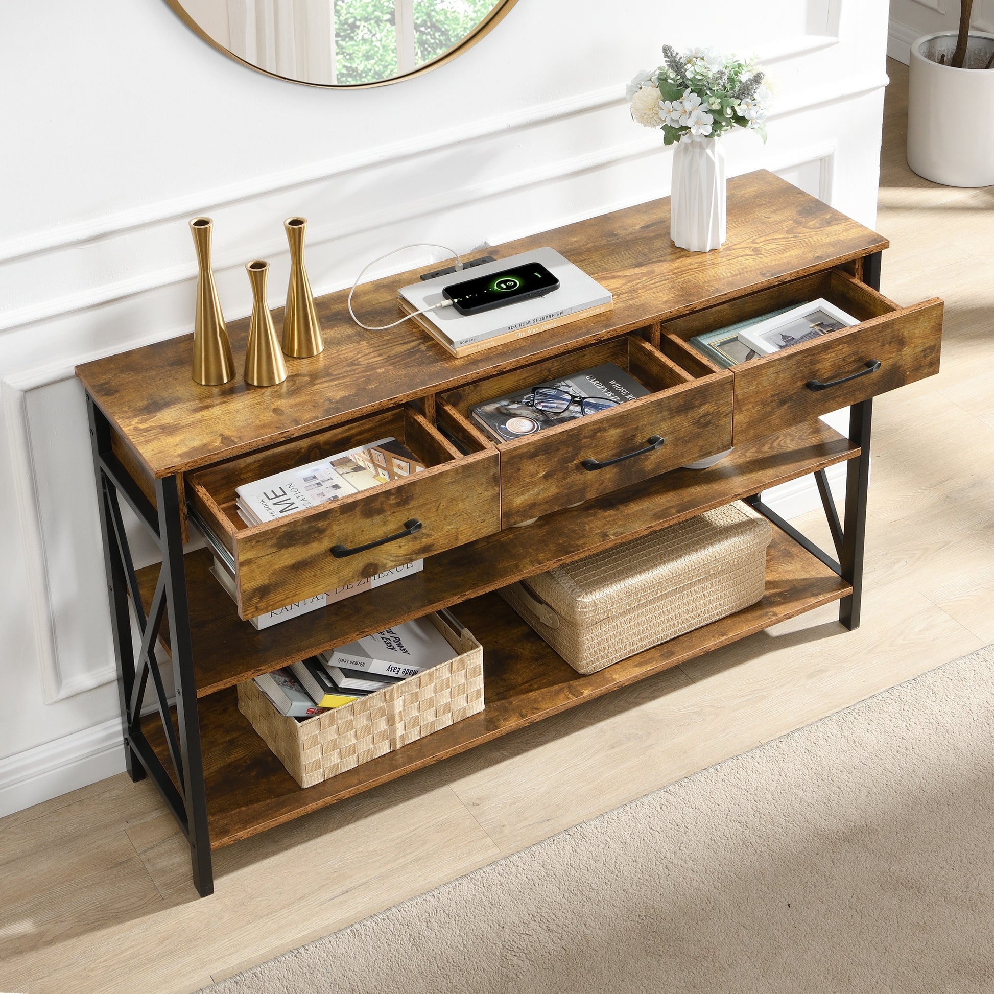 Console Table with 3 Drawers and Charging Station