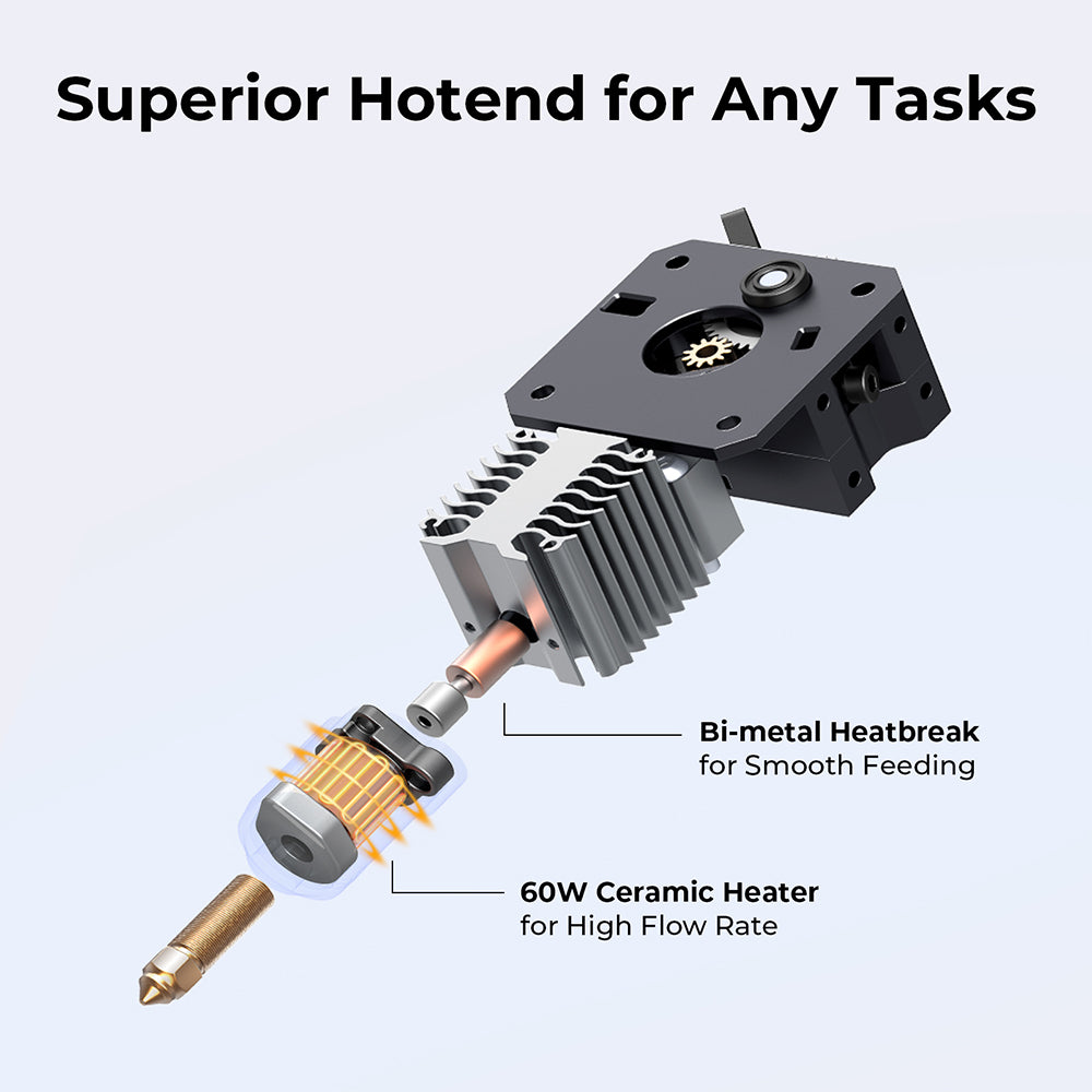 - Direct extrusion and 60W heater: the dual-gear direct drive extruder exerts a strong and uniform force to handle various filaments including flexible TPU, the printhead also has a 60W ceramic heater encircling the hotend, able to fully melt filaments, the bi-metal heatbreak of copper and titanium alloys effectively prevents thermal creep, it can feed on the fly at a 300℃ temperature