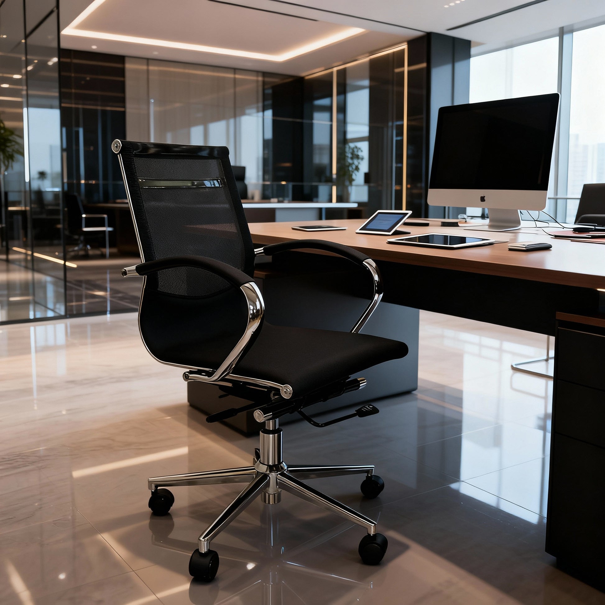 - Ergonomically designed lumbar support (mid-back design), headrest (integrated into mid-back structure), armrests (fixed with breathable mesh covers)