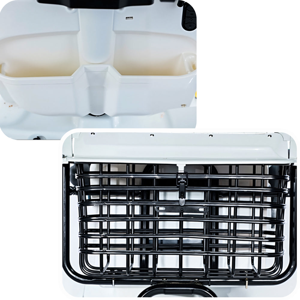Features a spacious front basket (53×33×27cm) and oversized rear basket (66×41×25cm) for transporting groceries, tools, or personal items.