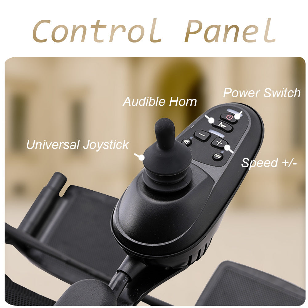 Includes a detachable 24V 12A battery for easy charging. Lightweight build and intuitive joystick controls support both elderly users and caregivers.