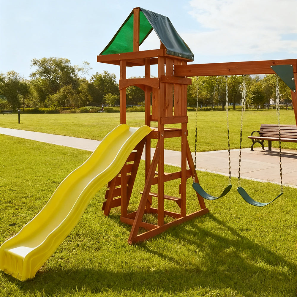 - Design: sturdy frame with rounded edges, non-slip ladder rungs, reinforced swing chains, and protective railings on the elevated play tower—ensures a secure environment for little adventurers, sun and rain protection: the polycarbonate roof on the play tower shields kids from harmful UV rays and light rain, extending playtime in various weather conditions, natural aesthetic with playful accents: warm wooden tones blend seamlessly with backyard/garden landscapes, while the bright yellow slide and green swing seats add a fun, inviting pop of color