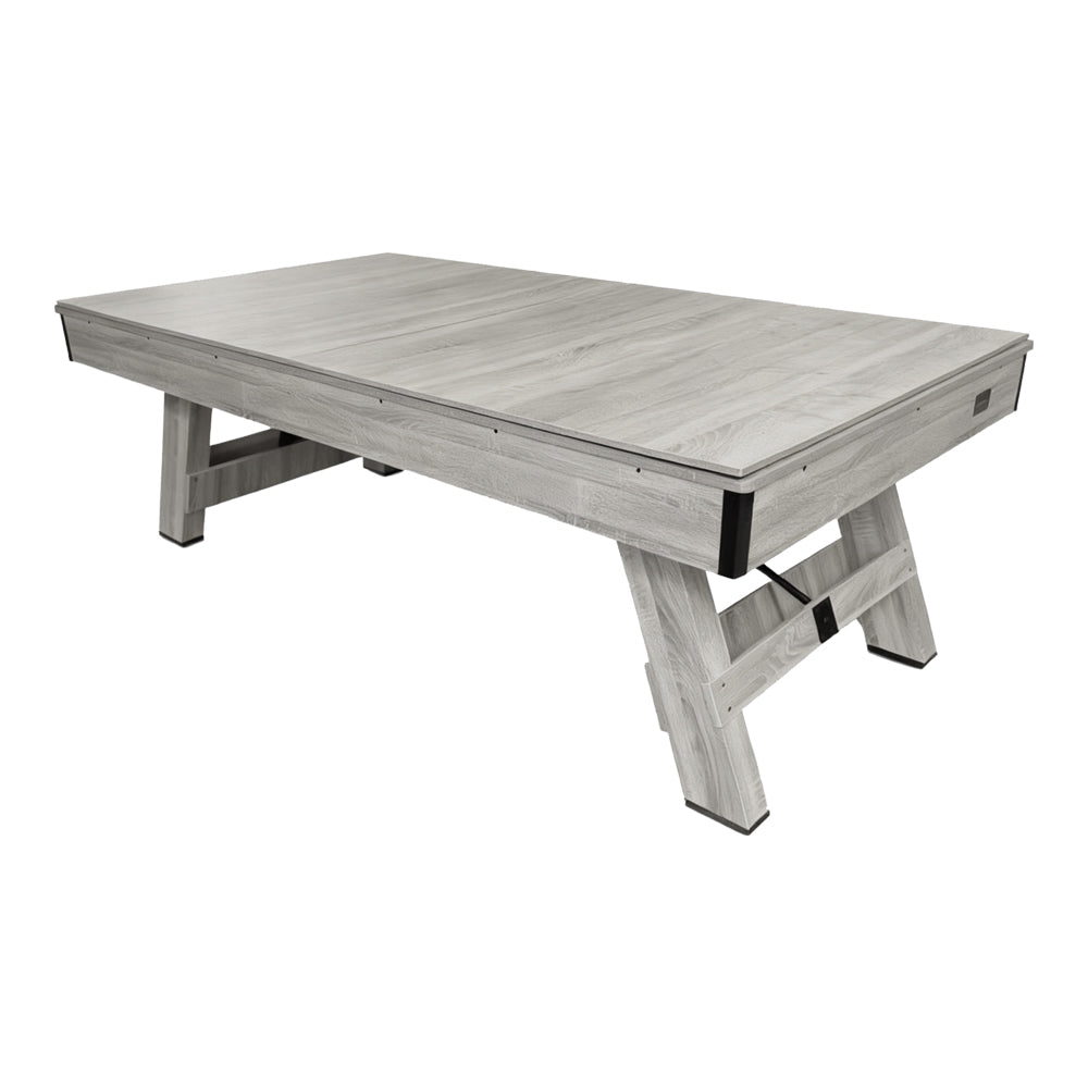 Accessories: Two cues, one set of balls, one triangle rack, one table brush, chalk, and one double-sided conversion top (ping pong table on one side, dining table on the other)