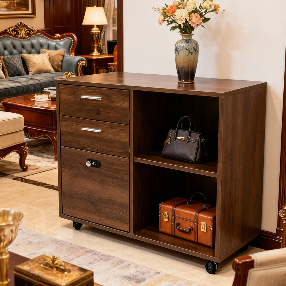 This versatile file cabinet combines lockable drawers and open shelving in a compact design, offering flexible storage for both home and office spaces. Its smooth-rolling casters and modern style make it easy to reposition while keeping your workspace tidy and secure.