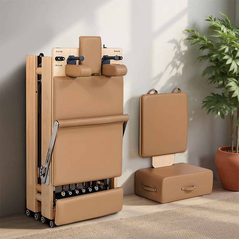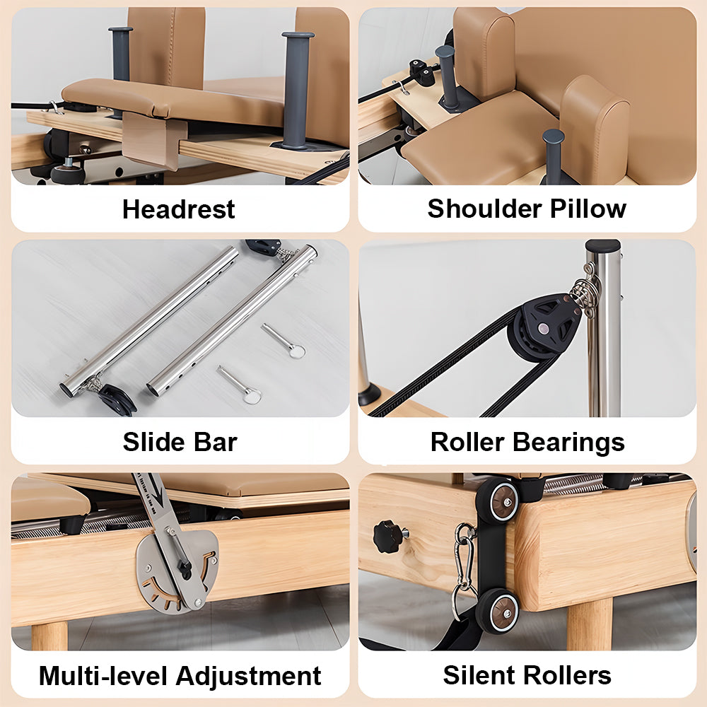 Experience studio-grade Pilates training at home with the Eeeza Foldable Wooden Reformer, built for both performance and elegance. Crafted from premium solid oak, this reformer features a 6-level spring resistance system, ergonomic PU padding, and a silent roller track. The foldable design with built-in wheels allows easy storage, making it ideal for compact living spaces without compromising on professional functionality.