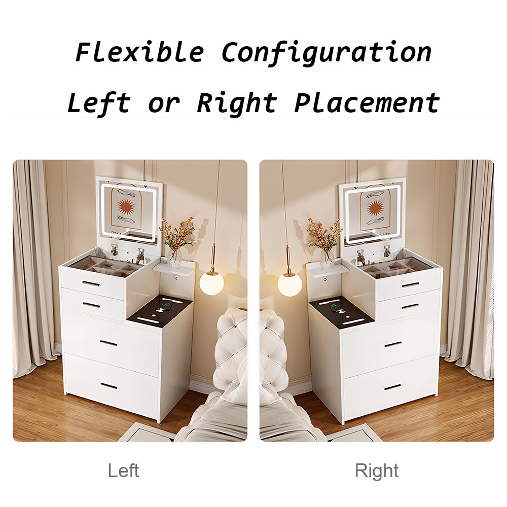 - Flexibly adaptable dressing table, with reversible cabinet placement (left/right configuration)