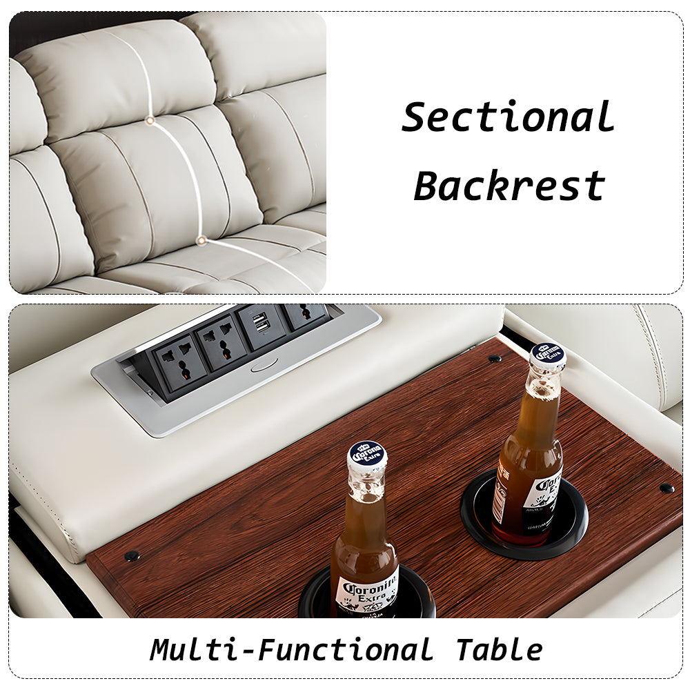 The middle section folds down into a smart table equipped with dual cup holders and a built-in power outlet (2 standard plugs + USB ports). Easily charge your devices or rest your drinks without leaving the seat.