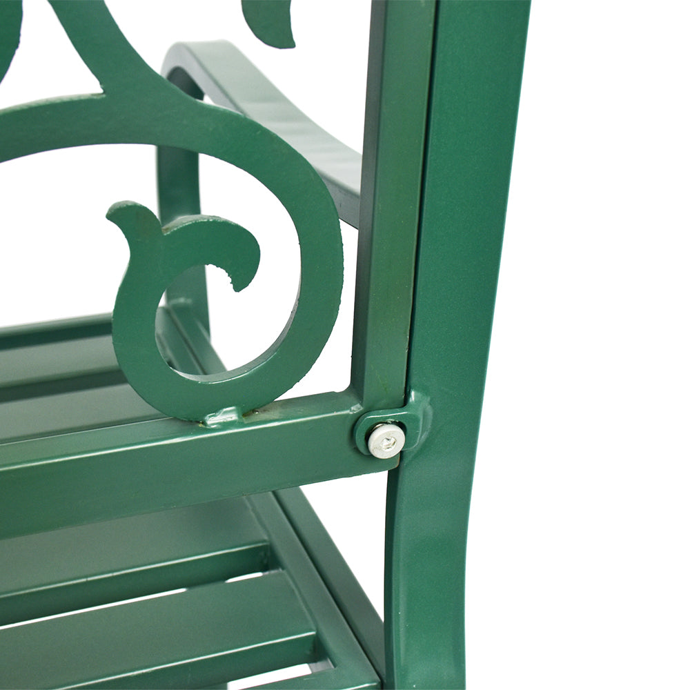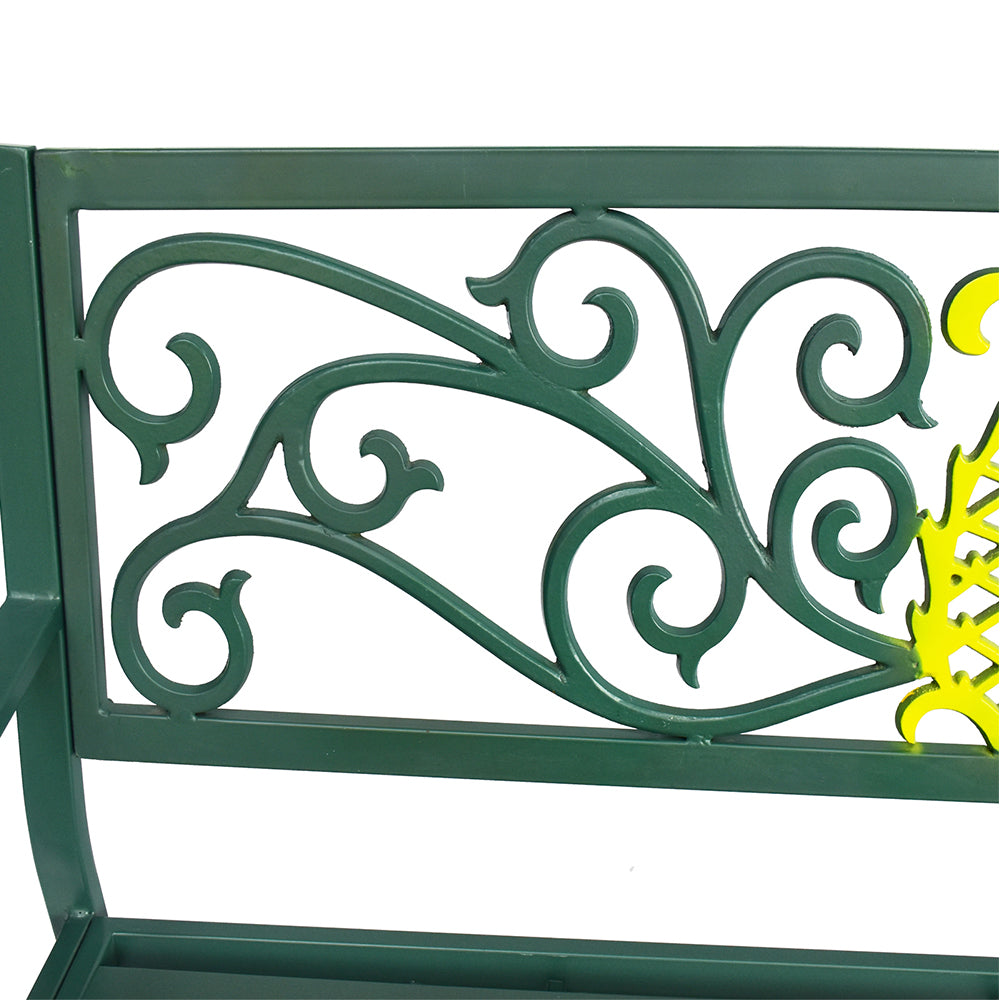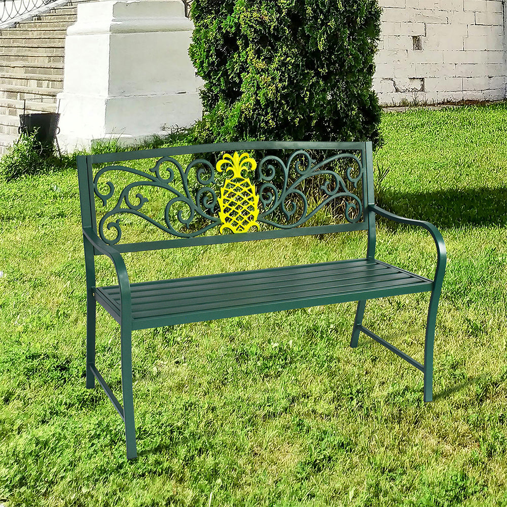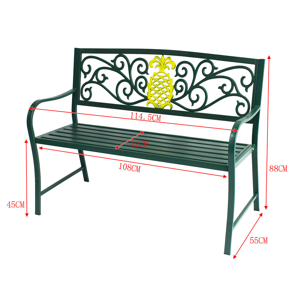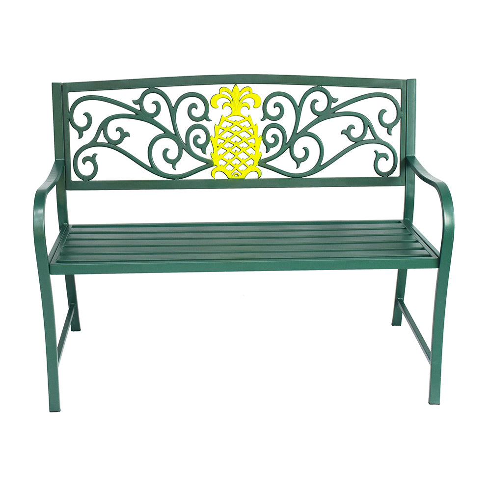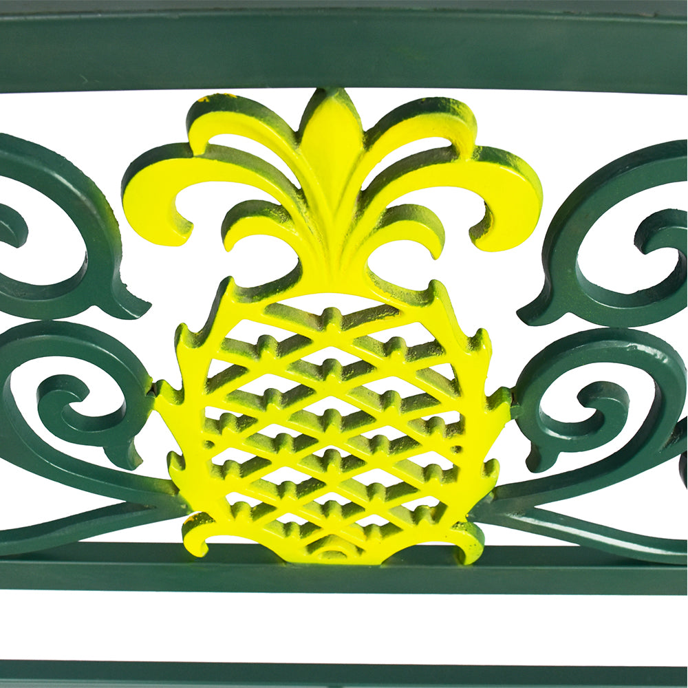 - Stylish design with slatted seat and nicely curved arms, power-coated green with a hand-painted gold pineapple, adds a bright color and infinite charm to your garden