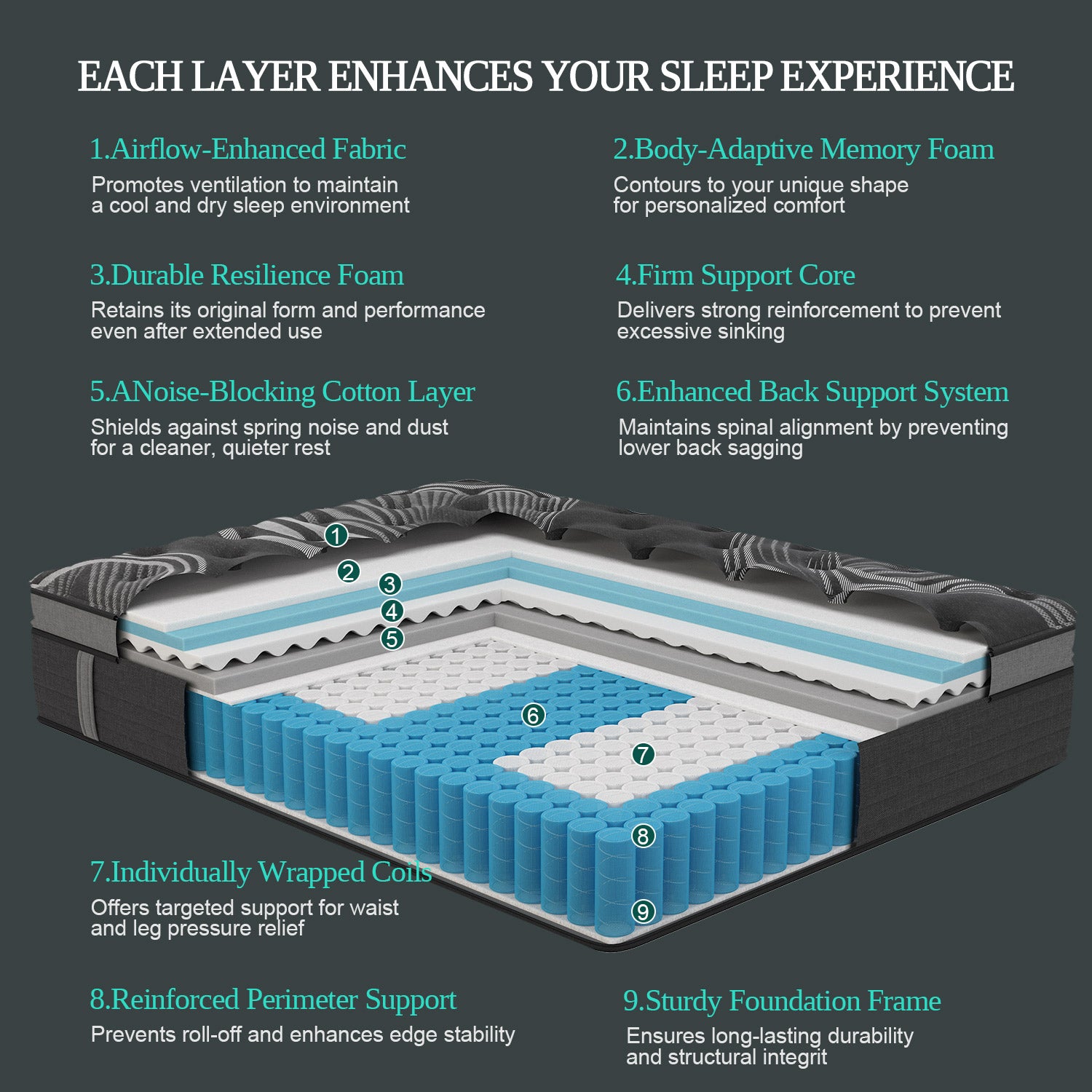 Responsive Multiple Layers: Constructed with pocket spring,cooling Gel-Infused memory foam and high resilience egg crate foam.The memory foam provide pressure relief to keep you comfortable through the night. The high-quality pocketed coils form a stable support system that gives you the best support your body needs. Relax your spine, hips, shoulders, and lower back for any sleep position