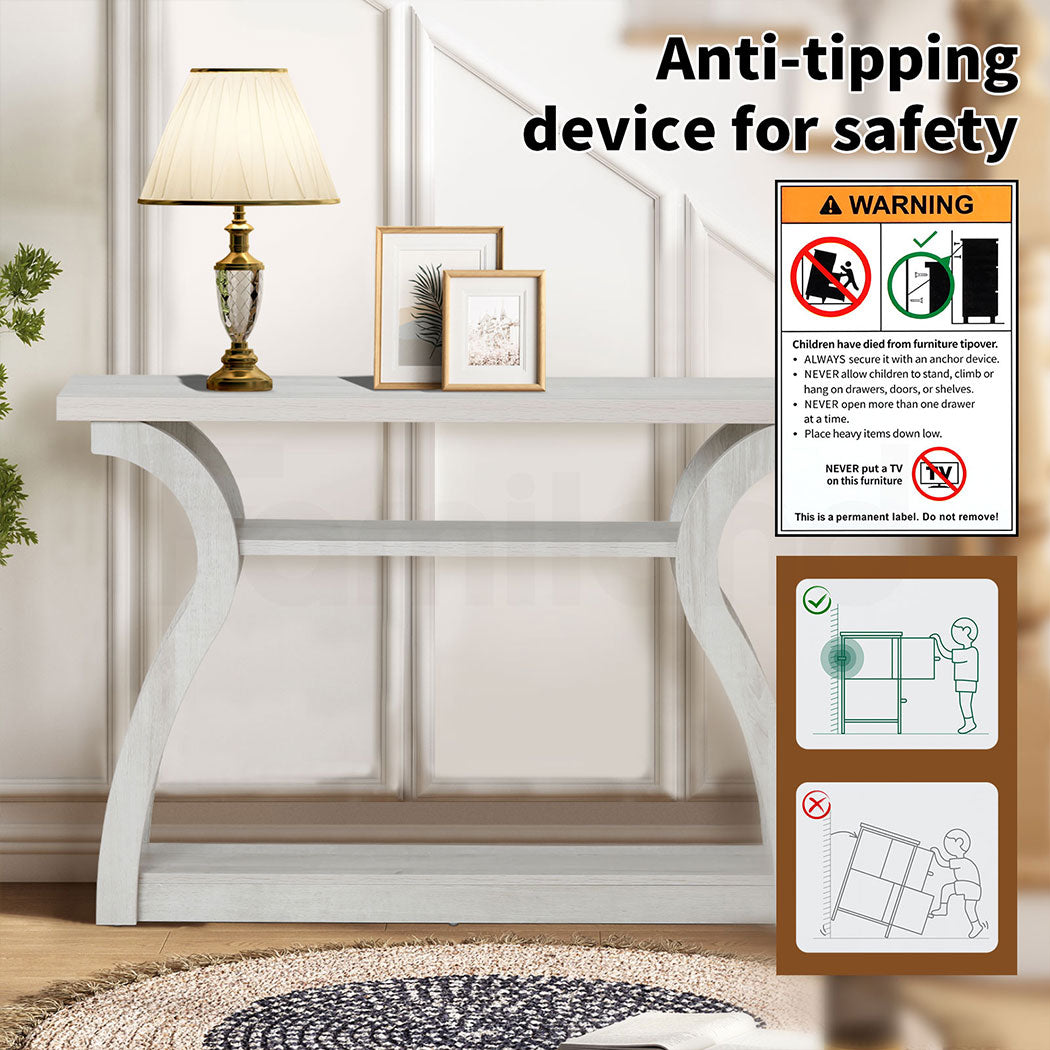 --【Safety Design Entryway Furniture】 Designed with safety in mind, this hallway table for entryway is equipped with an anti-tipping device to prevent accidents, making it a child-friendly option. The 4 adjustable foot pads ensure stability on uneven floors while protecting your tile and wood surfaces from scratches.