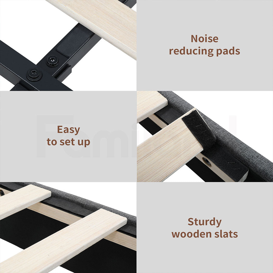 --【Sturdy & Durable Structure】Built with high-quality steel, solid wood slats, and reinforced by nine heavy-duty legs, the Familand platform bed frame queen size supports up to 250kg. This robust design evenly distributes weight and prevents mattress sagging, ensuring a quiet, comfortable sleep experience.