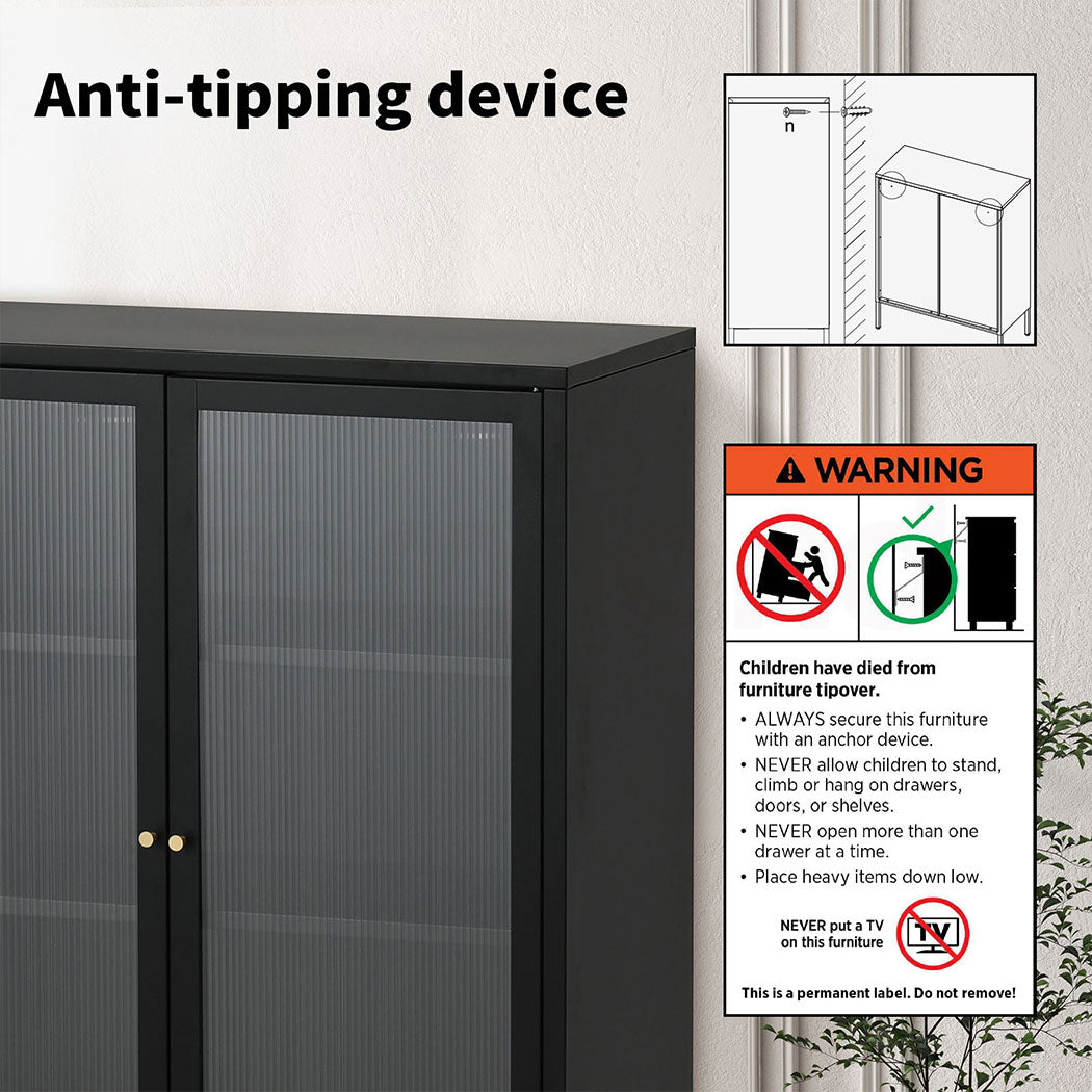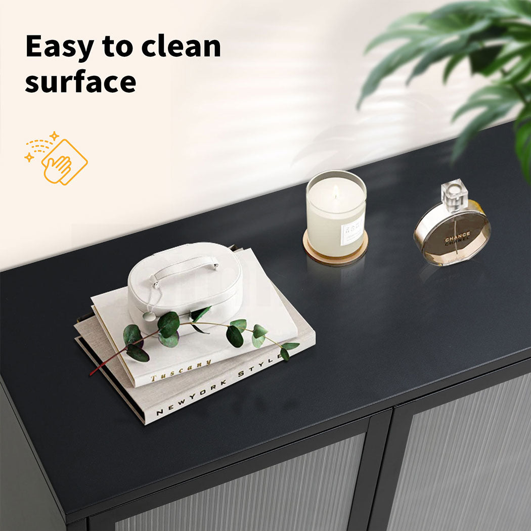 Crafted from high-quality cold-rolled steel, this 2-door sideboard is resistant to water, rust, erosion, and heat, ensuring durability and long-lasting performance. Its standout feature is the transparent doors, which not only enhance its modern aesthetic but also allow you to easily view and locate your stored items.