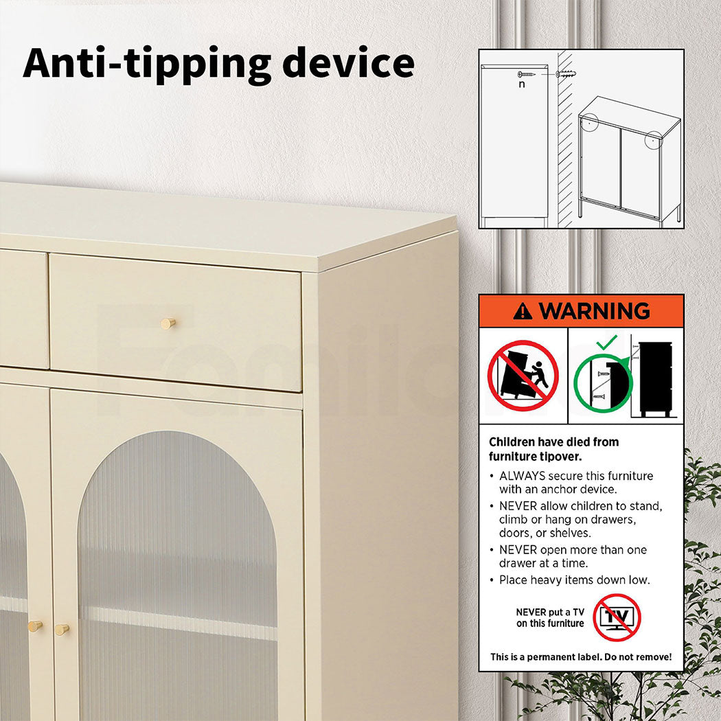 --【Premium Quality Materials】Crafted from cold-rolled steel and transparent panels, this sideboard is both durable and stable. Its sturdy construction ensures exceptional strength, while the materials resist rust, erosion, and wear. The transparent panels offer excellent light transmission, enhancing the storage cabinet's modern appeal and making it a sophisticated addition to high-end home decor.