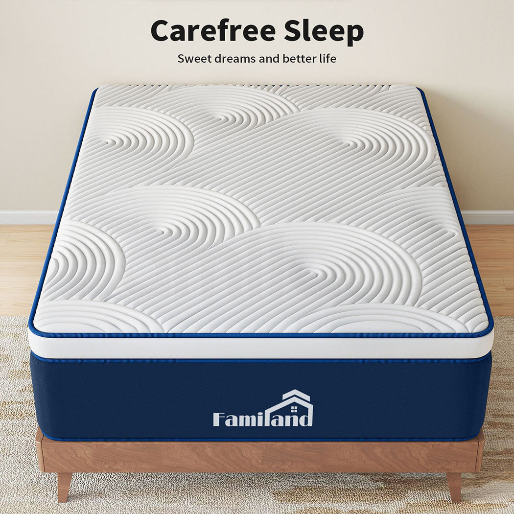 ---Quiet & Independent Pocket Springs: Built with premium pocketed coils and slow-rebound foam, the Familand hybrid memory foam mattress minimizes noise and vibration caused by movement during sleep. This design promotes uninterrupted rest for you and your partner. Additionally, the thickened coils around the edges provide strong edge support, reducing the risk of falling off.