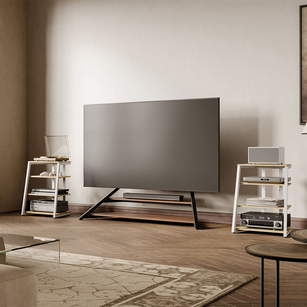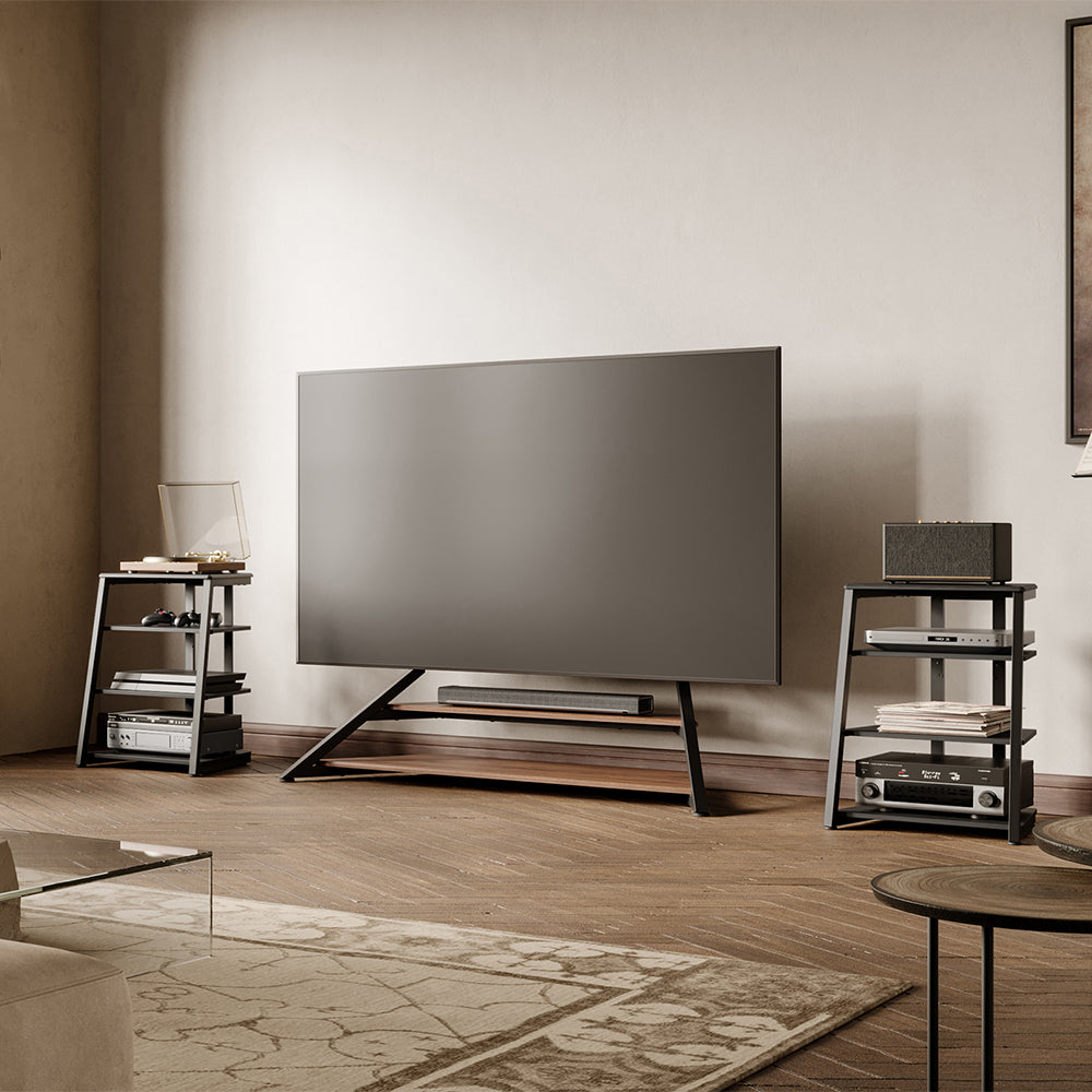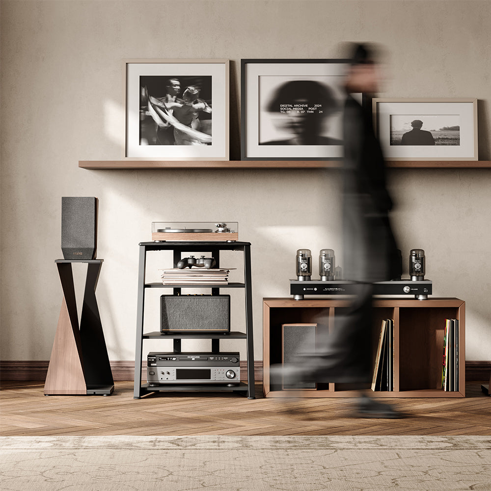 Designed to blend seamlessly into your living space, this HiFi Audio Rack combines modern minimalism with vintage charm. The warm walnut woodgrain pairs with a sleek trapezoidal frame to deliver both style and substance—making it an ideal solution for storing record players, speakers, amplifiers, and more.