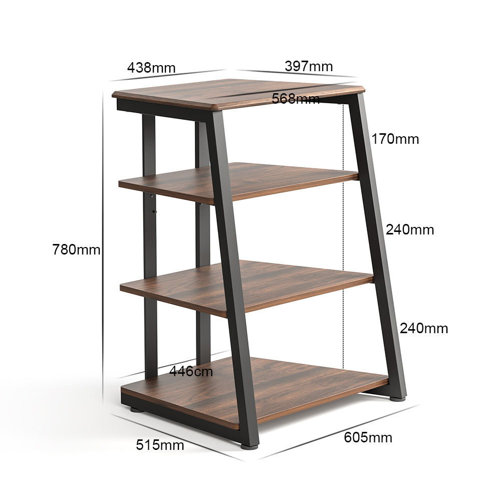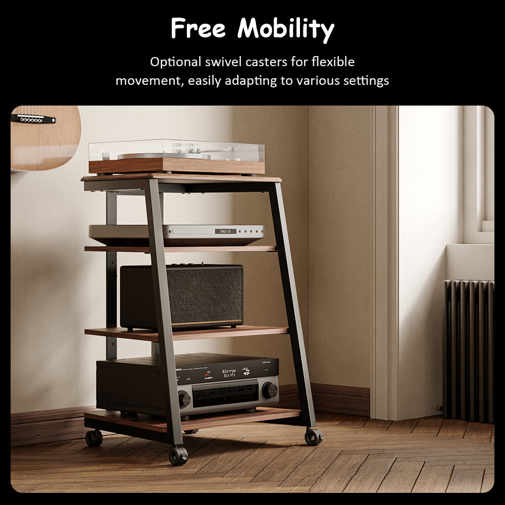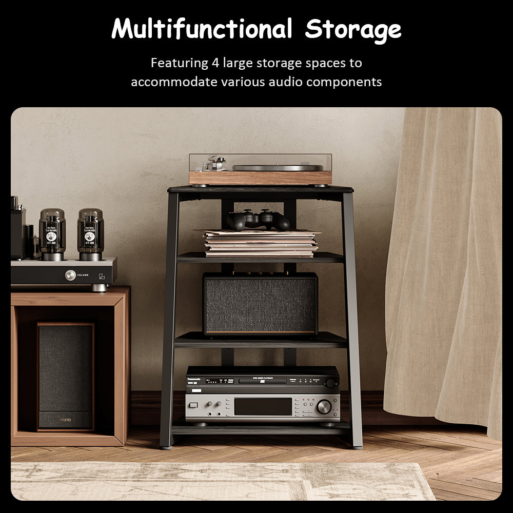 Equipped with four shelves (61 × 56.5 × 78cm), including two height-adjustable layers, the rack accommodates amplifiers, record players, CD decks, game consoles, Blu-ray players, and even small flat-screen TVs. The top shelf supports up to 10 lbs (4.5kg), making it perfect for daily audio essentials.