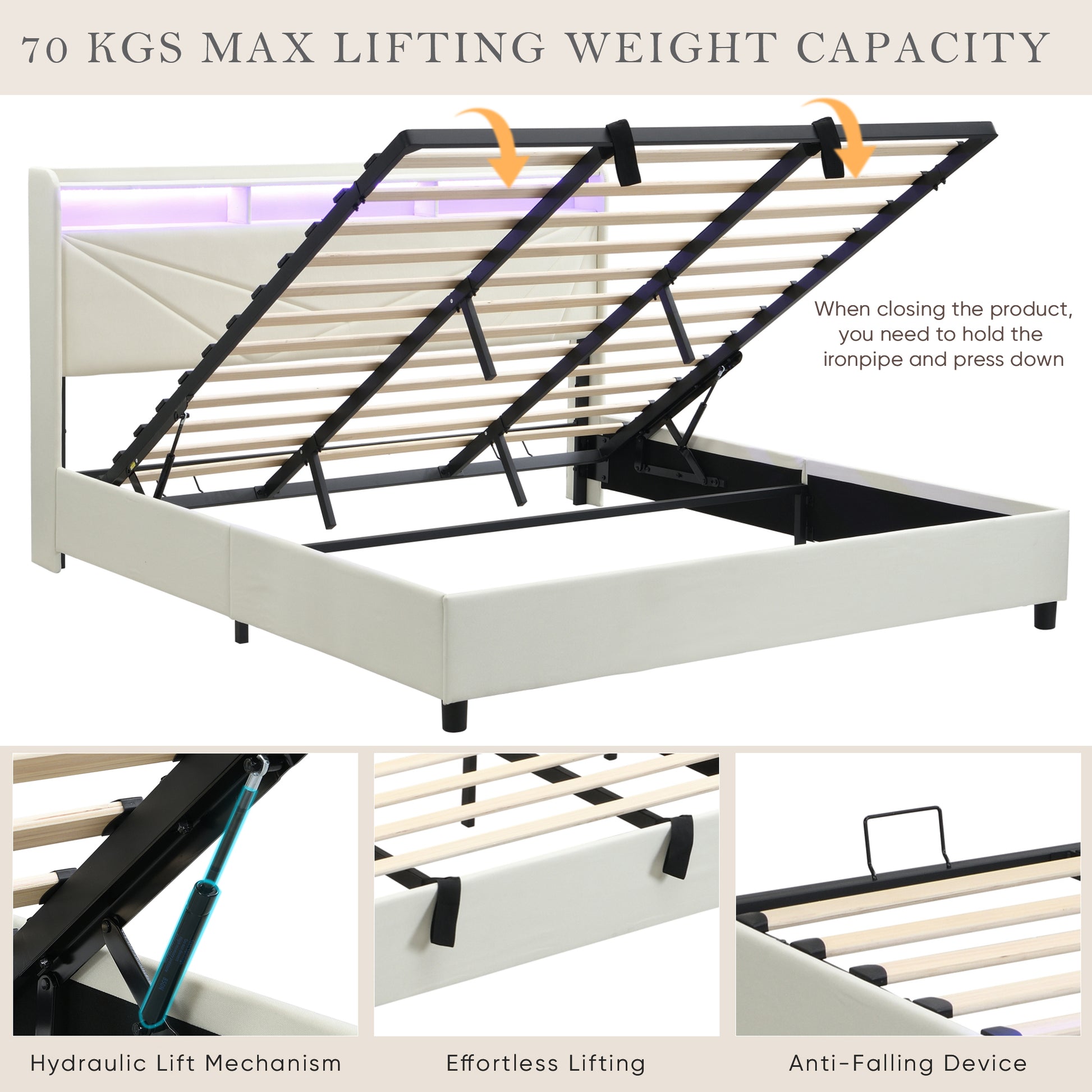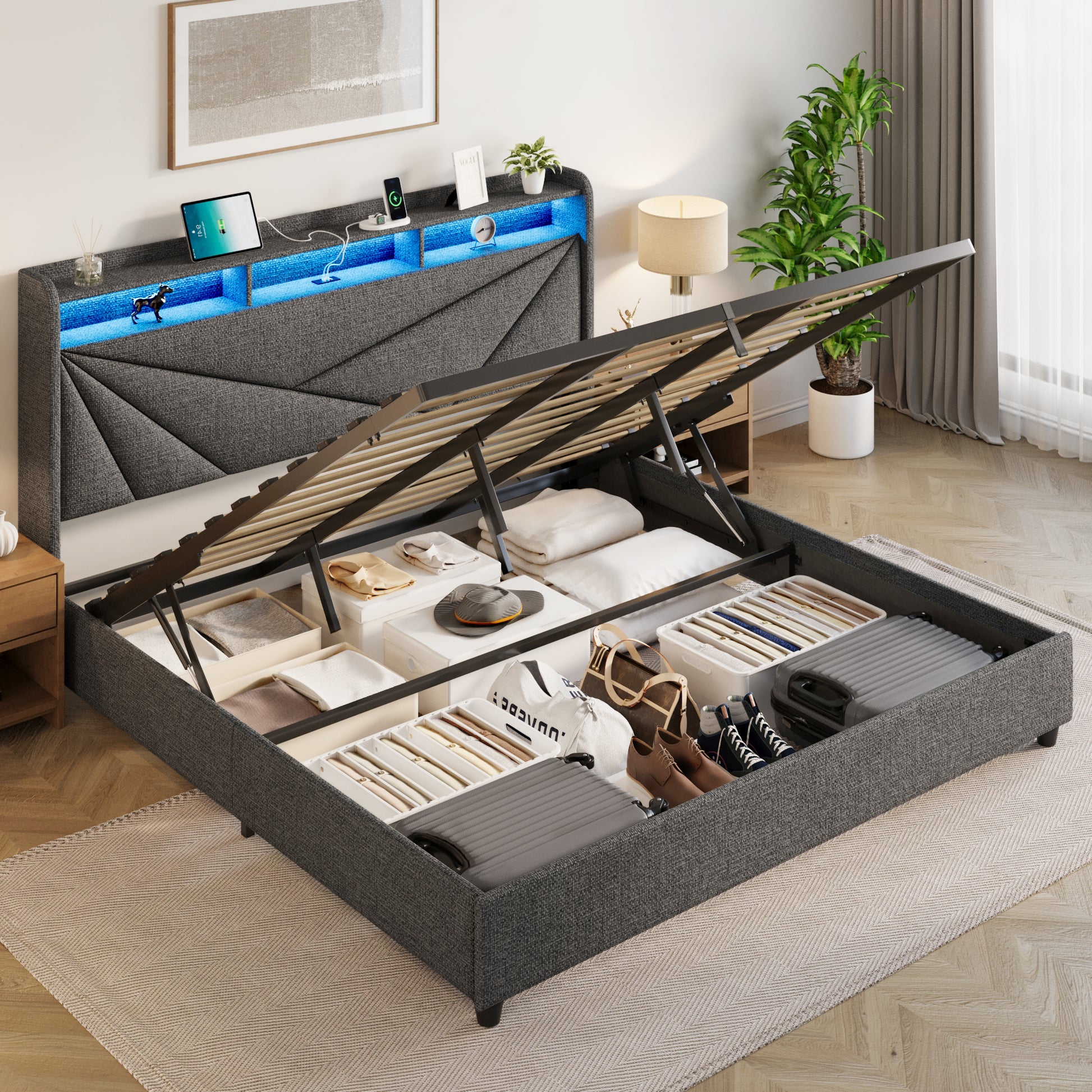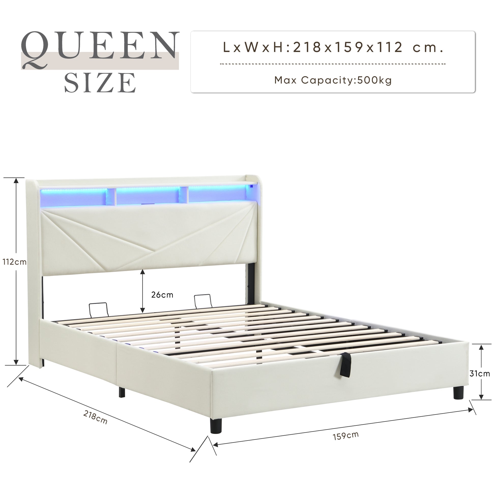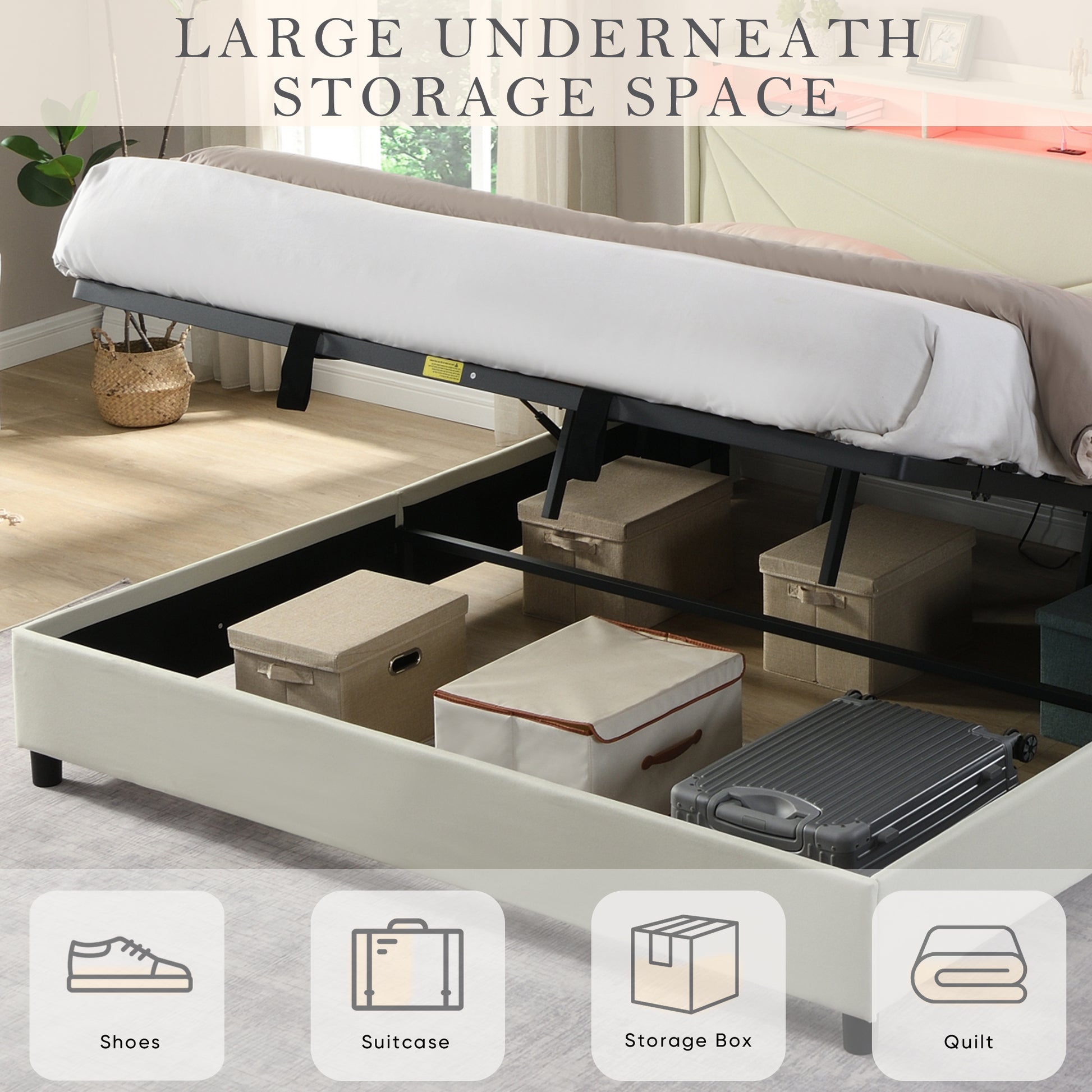Gas Lift Bed Frame with LED Lights and Charging Station, Modern Upholstery Bed Storage Headboard (Without mattress)