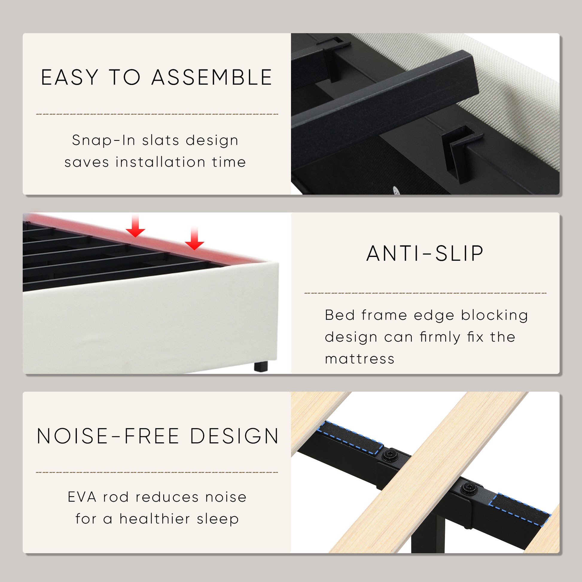 --Space-Saving Design: Our platform bed frame is equipped with 4 dust-proof storage drawers. Instead of using wire mesh, we've upgraded to non-woven material for the storage area, which not only provides ample space under the bed but also prevents dust and small items from falling through. This eliminates the need for additional cabinets!