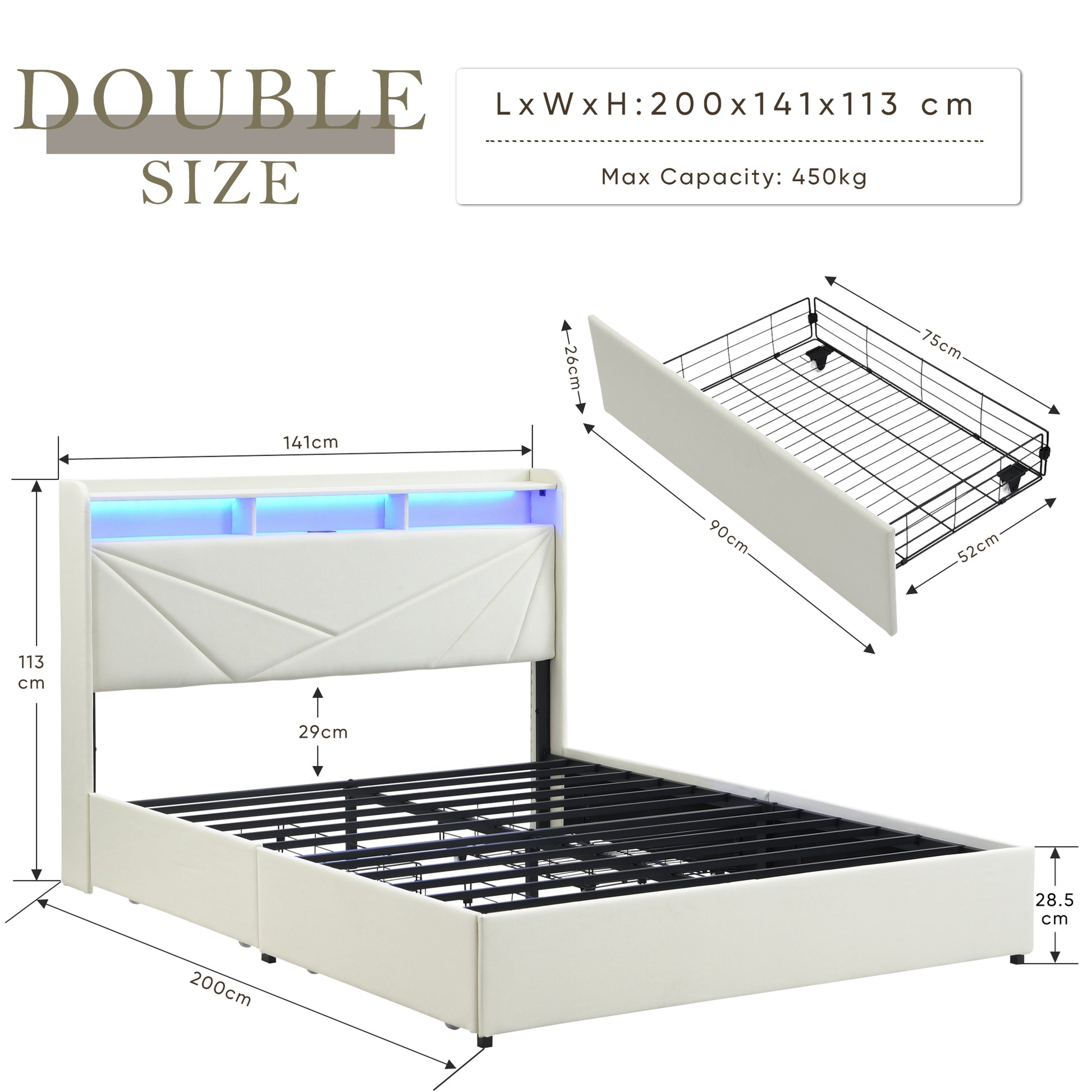 This bed frame is a perfect addition to any bedroom, blending sophisticated aesthetics with practical utility. Crafted from durable metal, it can support up to 400-500 kgs, ensuring long-lasting durability. The headboard includes a convenient storage shelf for easy access to small essentials. Additionally, four spacious drawers beneath the bed offer hidden storage to keep your space organized. Equipped with a built-in charging station and an RGB light strip, this bed frame allows you to charge your devices effortlessly while creating a vibrant and cozy atmosphere. Transform your bedroom experience with a touch of style and convenience.