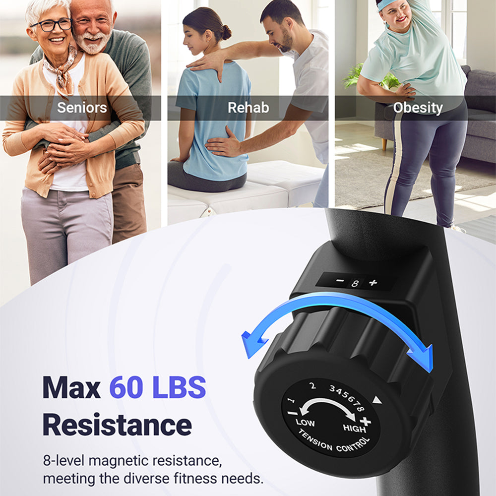 - Our recumbent exercise bike stationary bike for senior adults with larger seat allows you to customize workout based on your needs, 1-3 levels are equivalent to warm-up exercises, 4-6 levels are equivalent to running body-building exercises, 7-8 levels belong to climbing mountain sport