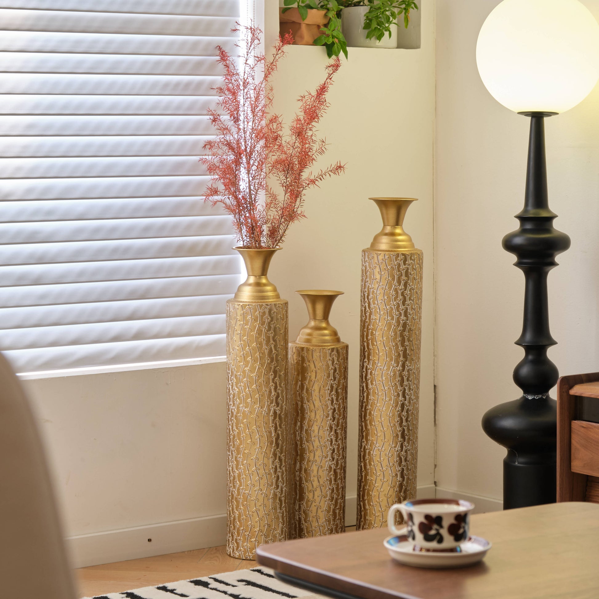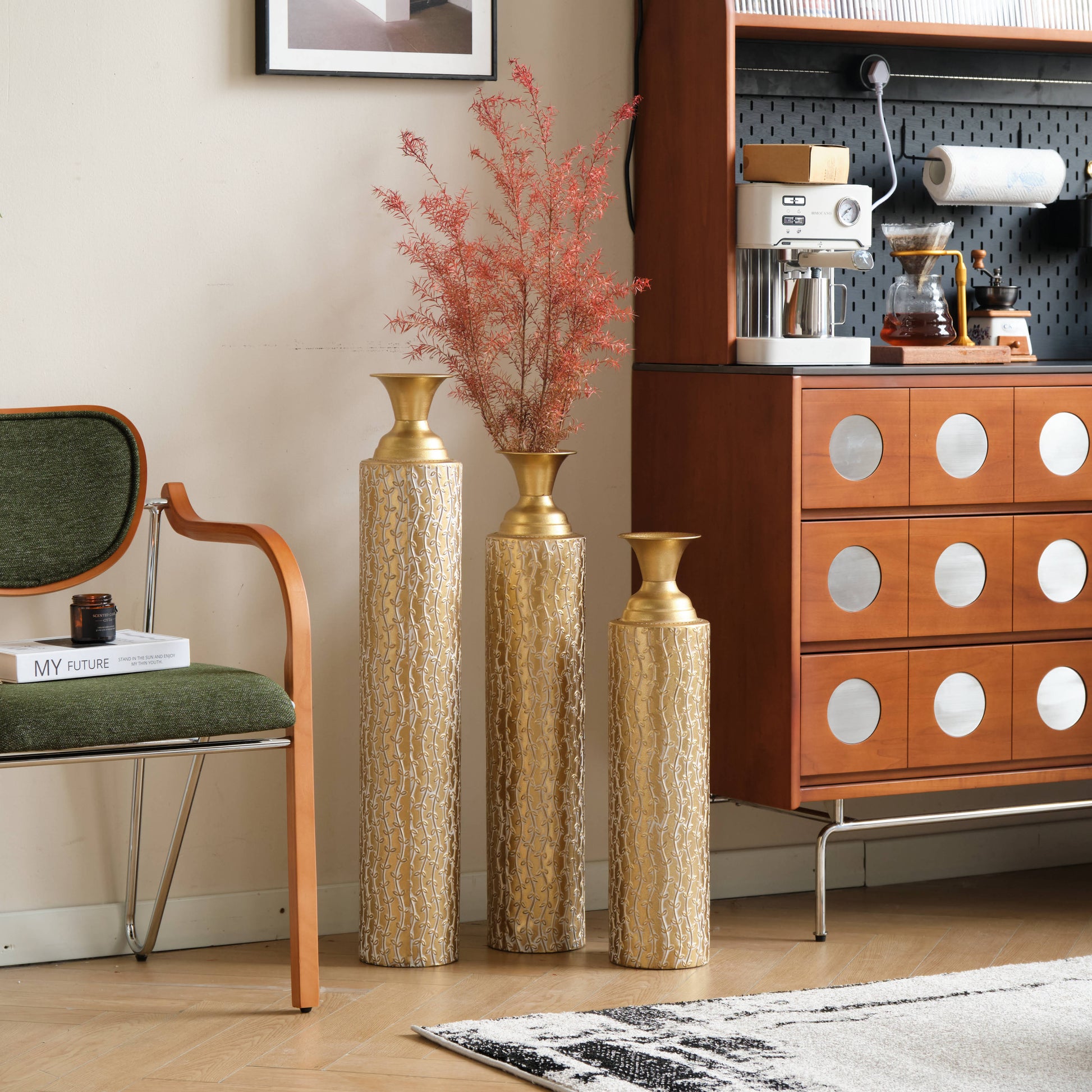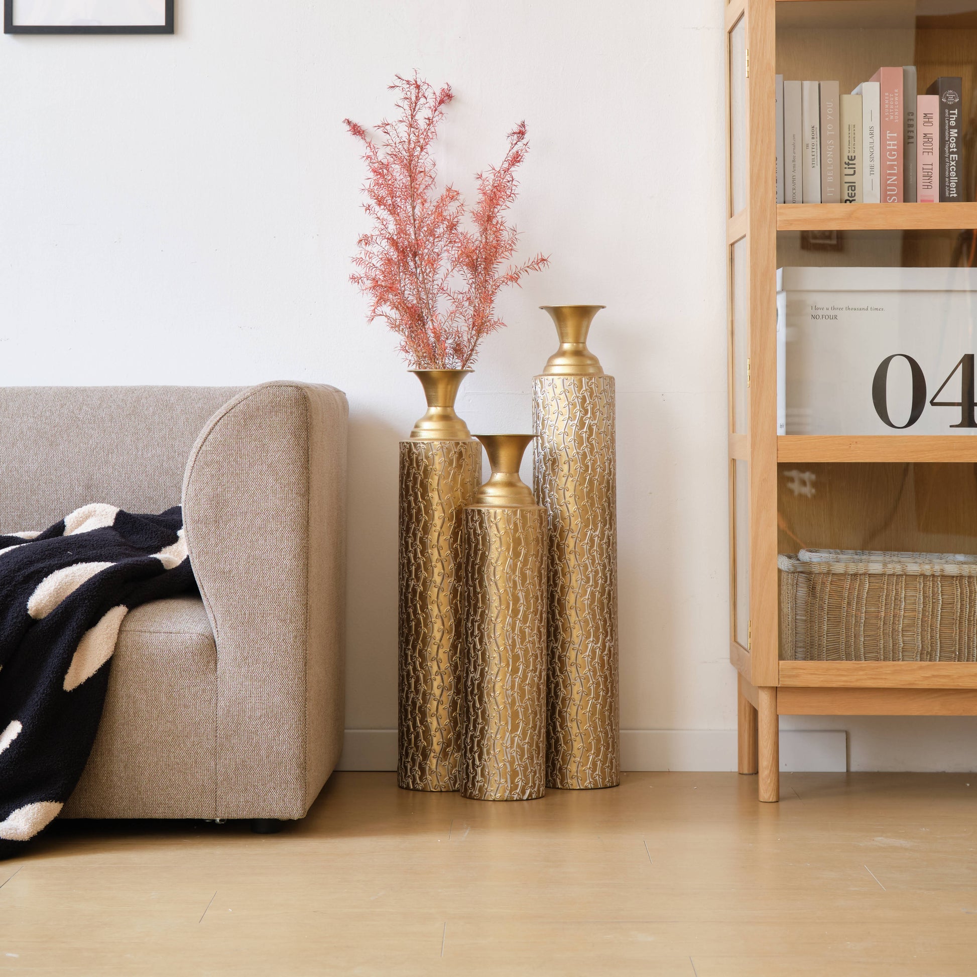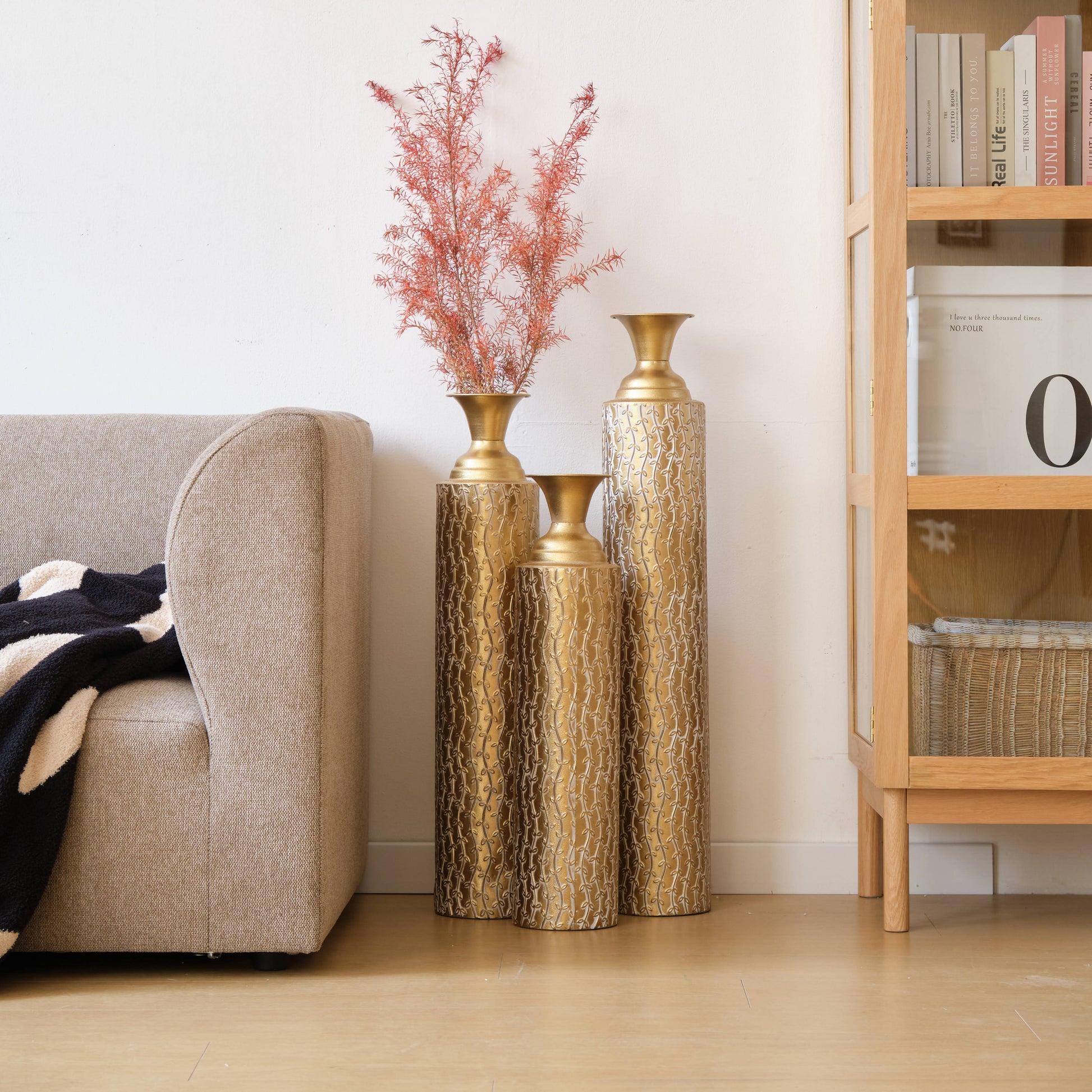 Add a touch of elegance to your home with this 3-piece set of antique gold metal vases. Crafted from durable metal, each vase features a sleek, geometric cylindrical shape with a funnel-shaped neck and embossed triangular detailing. The set includes three sizes - large, medium, and small - perfect for showcasing flowers or standing as stylish décor. Whether placed in the living room, hallway, or entryway, these vases bring a sophisticated, glamorous flair to any space, making them an ideal addition to modern or contemporary interiors.
