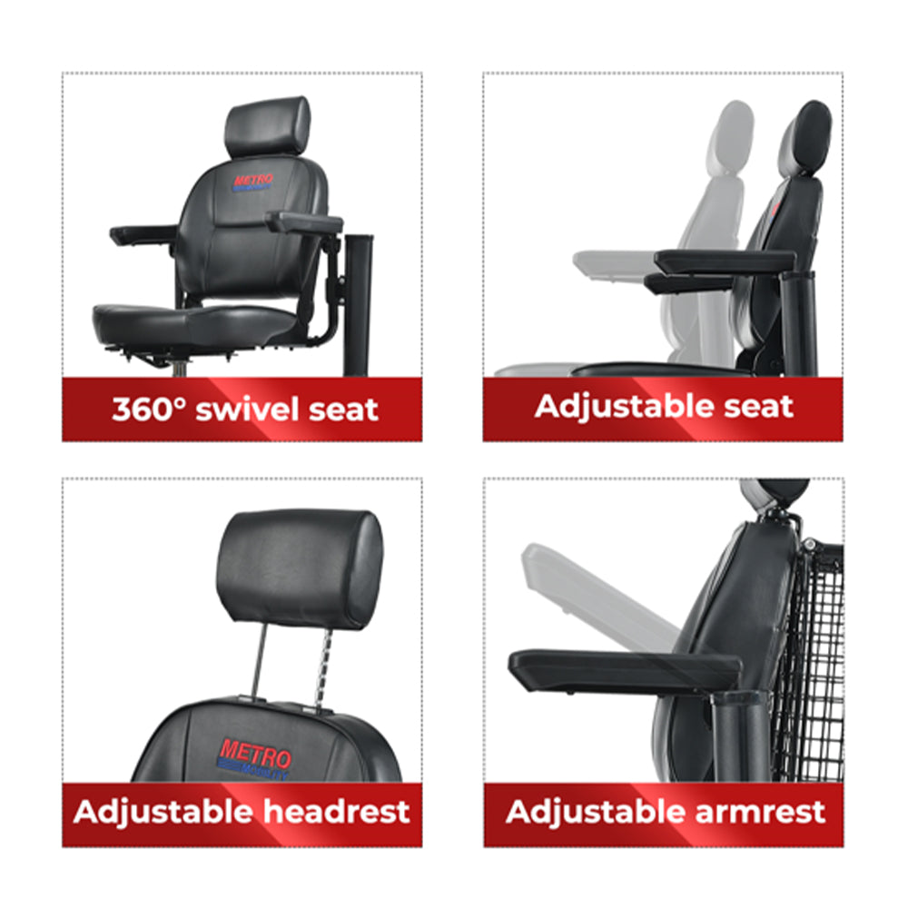 - Comforable seat with headrest, crutch holder accessories, sliding swivel seat with flip-uparmrests, rear basket, rearview mirror