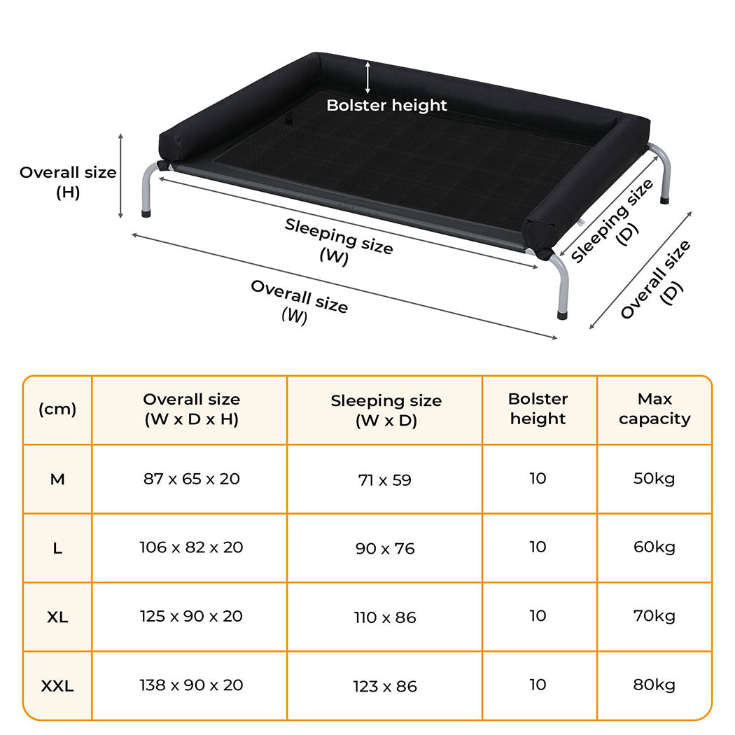 ---【Durable Steel Frame】Built with a sturdy steel frame, this pet trampoline bed offers strong stability and can support pets weighing up to 80 kg. The skid-resistant feet keep it in place, preventing unwanted movement. Available in four sizes, the pet beds are perfect for small to extra-large dogs.
