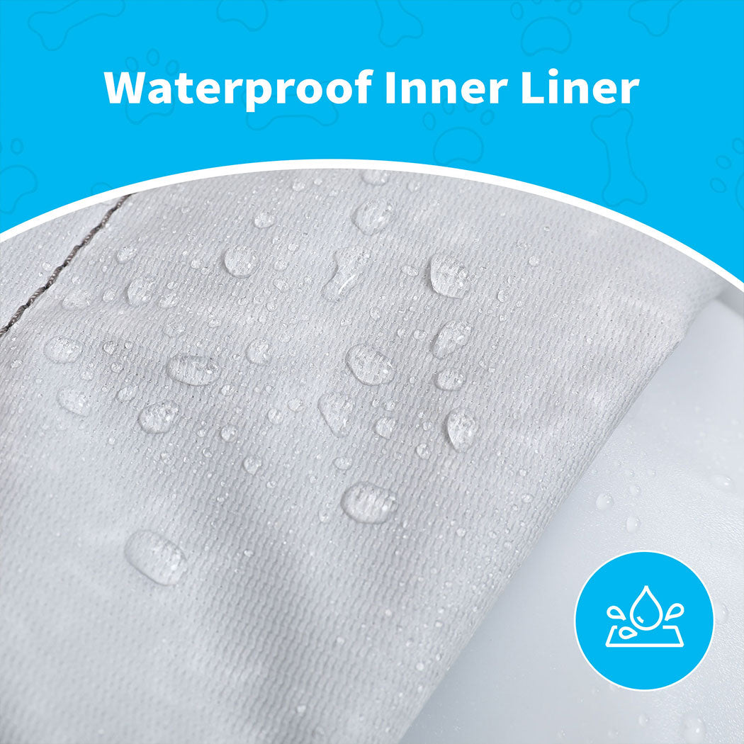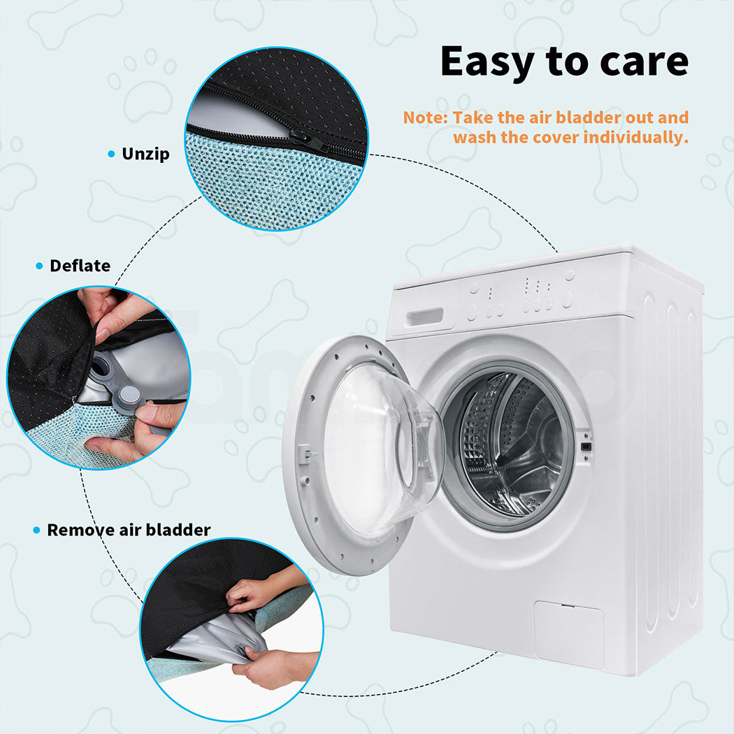 The waterproof inner liner between the fabric surface and inflatable layer prevents urine from penetrating, making cleaning a breeze. The cover of the washable dog bed is removable and can be easily unzipped for washing. Only the outer cover is machine washable—please remove the inflatable cushion before washing the cover separately.