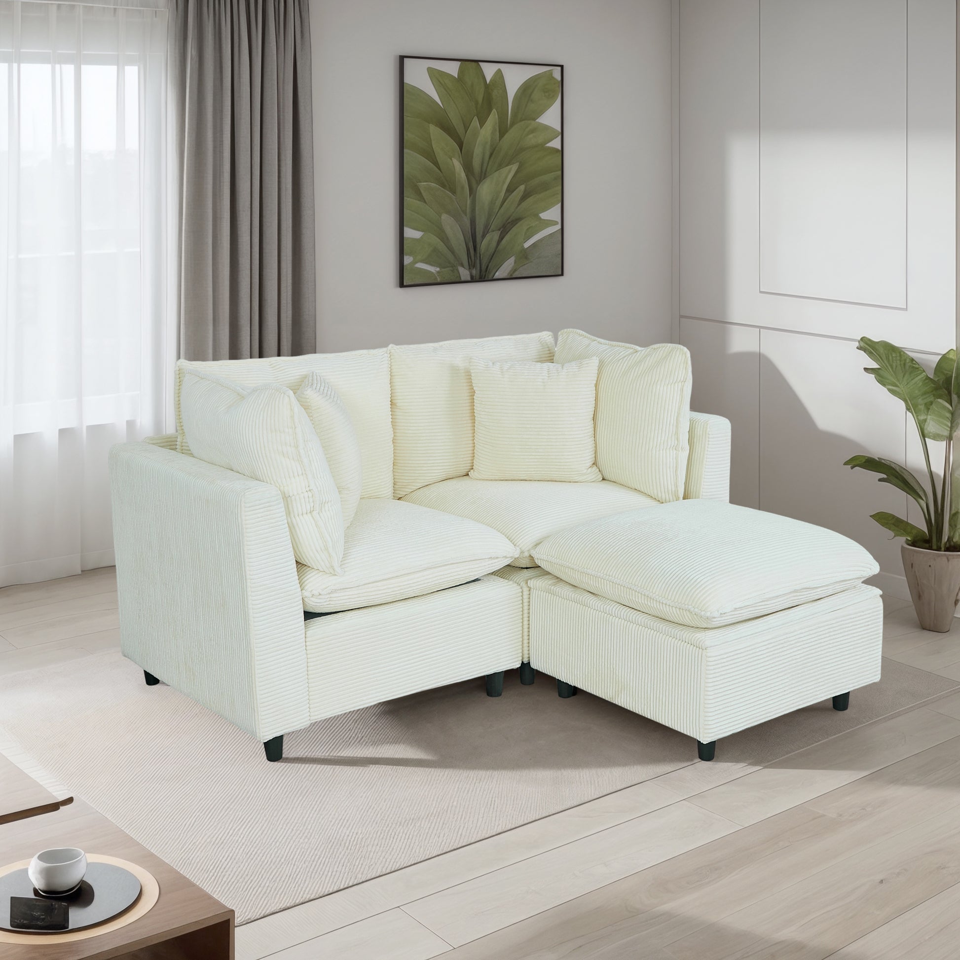 The corduroy two-seater sofa is the foundation of romance, while the ottoman adds a touch of effortless freedom—two people leaning close, chatting idly, feet resting on the plush ottoman. The comfort of home extends seamlessly from the sofa to your very toes.