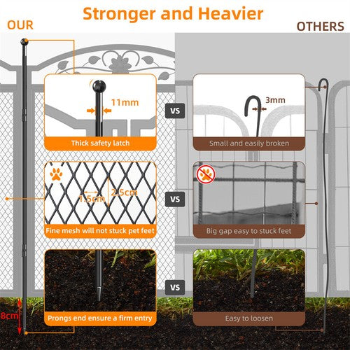 【8 Panels DIY Shape】Comes with 8 panels, each 61*80cm, which can easily form a large area in indoor room or outdoor backyard, can be shaped into octagonal, squared, or L -shaped, you can buy two(16panels) or three(24panles) and make a bigger space for dogs to move around and play, equipped with prongs end, which is 88cm height in total, easily insert into the ground to keep firm and stable when used outdoors